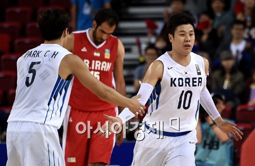 [인천=아시아경제 김현민 기자] 아시안게임 남자 농구대표팀 조성민이 3일 인천 삼산월드체육관에서 열린 이란과의 결승전에서 득점에 성공한 뒤 박찬희와 하이파이브하고 있다.
