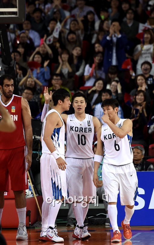 [인천=아시아경제 김현민 기자] 아시안게임 남자 농구대표팀 조성민이 3일 인천 삼산월드체육관에서 열린 이란과의 결승전에서 골밑슛에 성공하며 보너스 원샷을 얻고 양희종, 양동근과 기뻐하고 있다.
