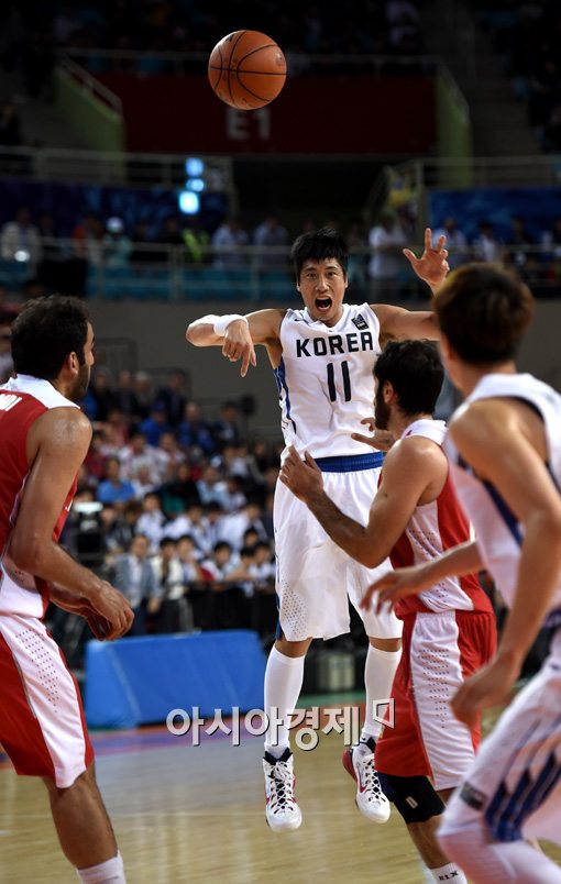 [인천=아시아경제 김현민 기자] 아시안게임 남자 농구대표팀 양희종이 3일 인천 삼산월드체육관에서 열린 이란과의 결승전에서 김종규를 향해 골밑 패스하고 있다.