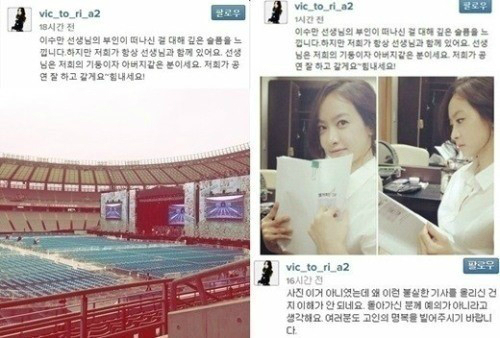 이를 접한 빅토리아는 "사진 이거 아니었는데 왜 이런 부실한 기사를 올리신 건지 이해가 안 되네요. 돌아가신 분께 예의가 아니라고 생각해요. 여러분도 고인의 명복을 빌어주시기 바랍니다"라고 불만을 표했다.
