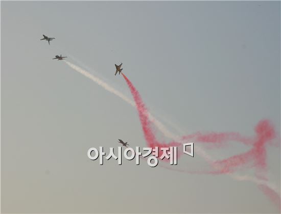 [아시아경제 수원=백종민 기자] 9일 수원시 공군비행장에서 개막된 '공군과 함께하는 2014 경기항공전'에서 공군 블랙이글팀이 아찔한 공중 기동을 펼치고 있다