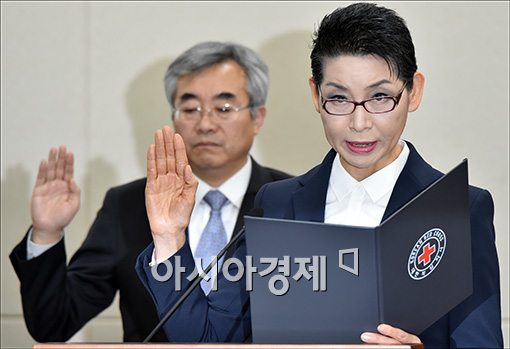 [아시아경제 윤동주 기자] 김성주 대한적십자사 총재가 27일 서울 여의도 국회에서 열린 보건복지위원회의 대한적십자사에 대한 국정감사에 출석해 증인선서를 하고 있다.