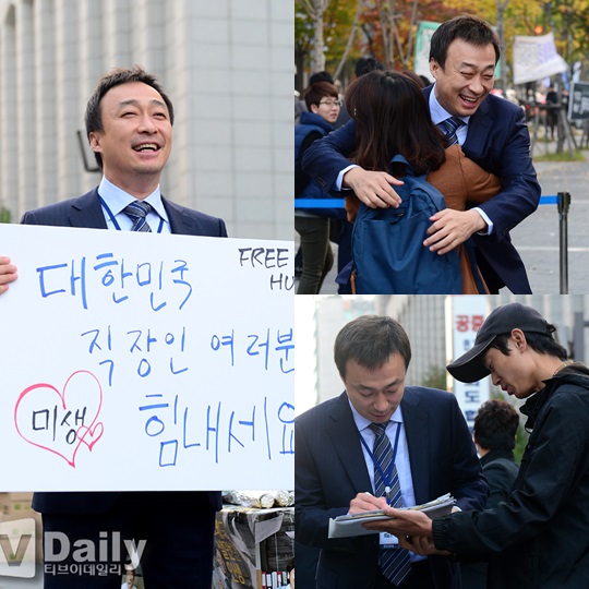 [아시아경제 온라인이슈팀] '미생'의 오과장, 배우 이성민이 시청률 공약을 지키기 위해 아침 출근길에 나선 직장인들에게 따뜻한 포옹을 선물했다.