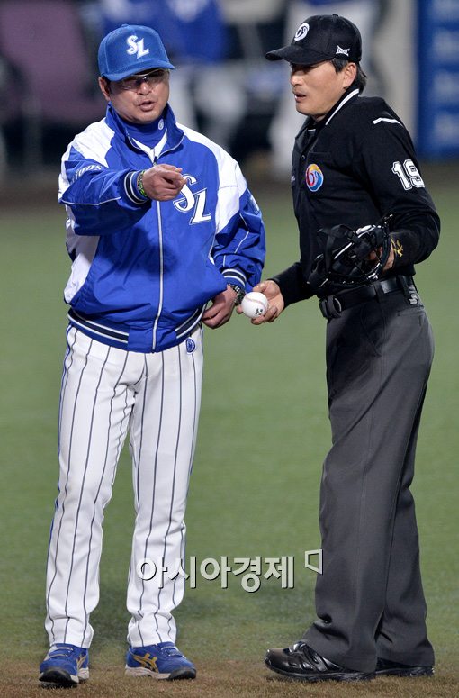 [대구=아시아경제 김현민 기자] 프로야구 넥센 히어로즈와 삼성 라이온즈의 한국시리즈 2차전이 5일 대구구장에서 열렸다. 삼성 류중일 감독이 6회말 선두타자 이지영의 타구가 몸에 맞고 아웃 판정을 받자 심판에 어필하고 있다.