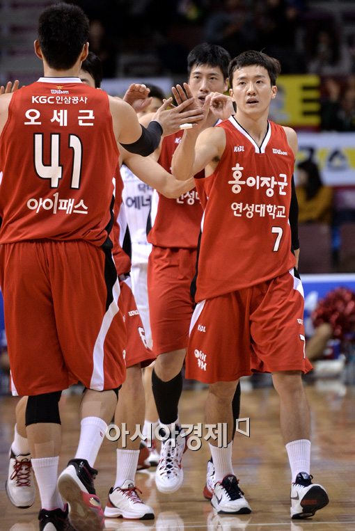 [안양=아시아경제 김현민 기자] 프로농구 안양 KGC와 고양 오리온스의 경기가 13일 안양실내체육관에서 열렸다. KGC 박찬희가 득점에 성공한 뒤 동료들과 하이파이브하고 있다.