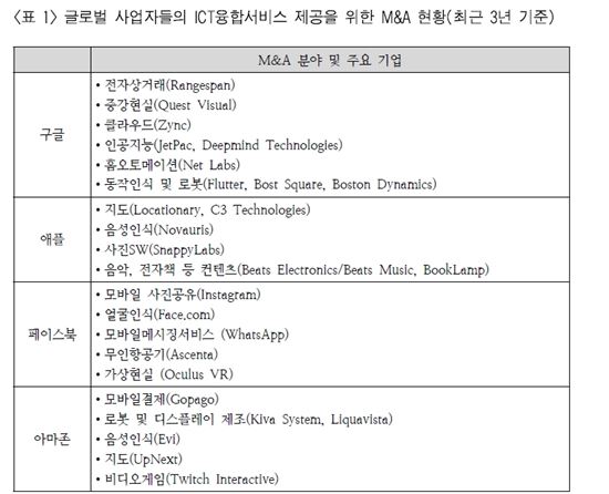 실제 최근 구글, 애플, 아마존, 페이스북 등 글로벌 ICT 기업들의 M&A가 활발하게 이뤄지고 있다. 대상 기업은 ICT생태계의 제조, 소프트웨어(SW), 콘텐츠 분야에서 가상현실(VR), 헬스케어, 로봇 및 무인항공기 등 ICT 융합 분야까지 다양하게 분포하고 있다.