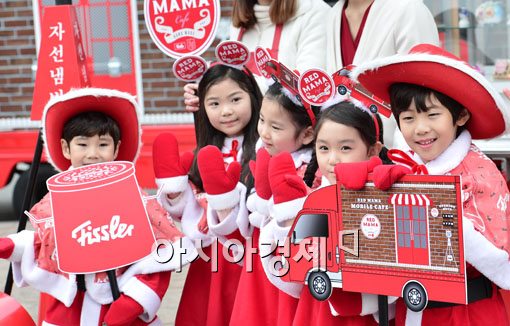 [아시아경제 백소아 기자] 27일 서울 중구 서울광장 앞에서 열린 레드마마 모바일 카페 기증식에서 어린이들이 산타복장을 하고 머리 위로 하트를 그리고 있다. '레드마마 모바일 카페'는 휘슬러코리아의 지속적인 비즈니스 멘토링을 통해 두리홈 소속 미혼모들이 직접 운영을 하게 된다.