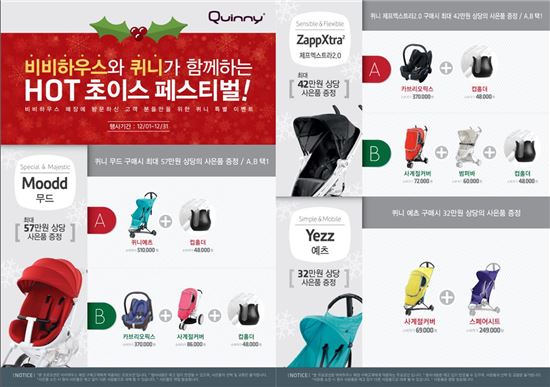 이번 행사에서는 비비하우스 매장에서 퀴니 유모차 구매시 최대 57만원 상당의 사은품을 증정한다. 퀴니 무드 혹은 제프엑스트라 2.0 제품 구매시 유모차와 호환 가능한 맥시코시 신생아용 카시트를 사은품으로 증정하며 퀴니전용 컵홀더는 기본으로 받아볼 수 있다.