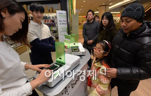 [아시아경제 최우창 기자] 한국벨킨이 7일 서울 잠실 롯데월드몰 반디앤루니스 매장에서 스마트폰 스크린 보호 및 케어를 위한 트루클리어 프로 어드밴스드 스크린 케어 론칭을 기념해 직원들이 시민들에게 무료 스크린 케어 서비스를 진행하고 있다.