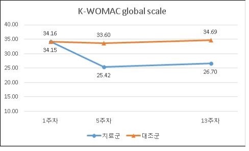 골관절염지수(WOMAC)란 캐나다 웨스턴 온타리오대학과 맥마스터대학 연구팀이 개발한 관절염 측정 지수로 관절의 통증, 뻣뻣함, 관절 기능 등을 환자의 설문으로 평가해 0에서 96사이의 숫자로 나타내며 수치가 높을수록 증상이 심하다.