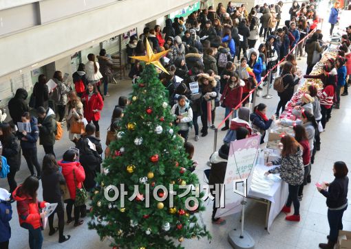 [아시아경제 백소아 기자] 16일 서울 서대문구 이화여자대학교에서 열린 '맛있는 이화사랑'행사에서 기말고사를 앞둔 학생들이 간식을 받고 있다. 이화여대는 기말고사를 준비하는 재학생들을 격려하기 위해 이번 행사를 개최했다.