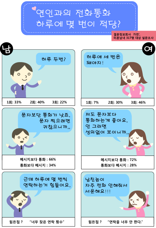 결혼정보회사 가연의 박미숙 이사는 “연락 횟수로 갈등을 빚는 연인들이 적지 않은 것으로 안다”며 “각자의 일과 삶이 있는 성인이기 때문에 서로의 상황을 배려하지 않는다면 계속해서 갈등이 생겨날 수밖에 없다”고 조언했다.