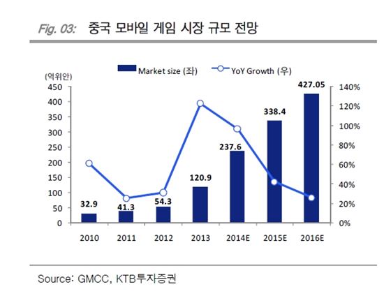 14일 관련업계에 따르면 중국의 시장 조사기관인 엔포데스크(Enfodesk)의 최근 발표 결과 지난해 중국 모바일게임시장 규모는 237억RMB (4조1000억원)이며 2016년에는 427억RMB (7조5000억원)로 성장할 것으로 전망된다.