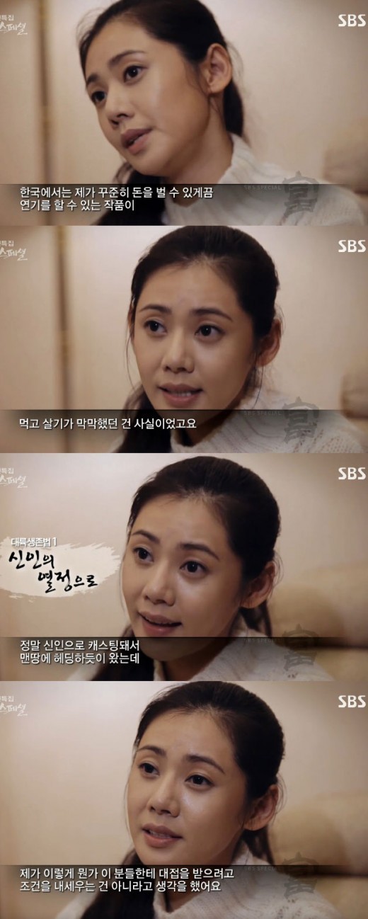 이날 추자현은 "그냥 배운게 도둑질이라고 연기를 해야 하는데 한국에서는 제가 꾸준히 돈을 벌수 있게끔 연기를 할 수 있는 작품이 끊이지 않고 들어오는 게 아니다 보니까 먹고 살기가 막막했던 것은 사실이었다"며 중국진출에 대한 솔직한 이유를 털어놨다.