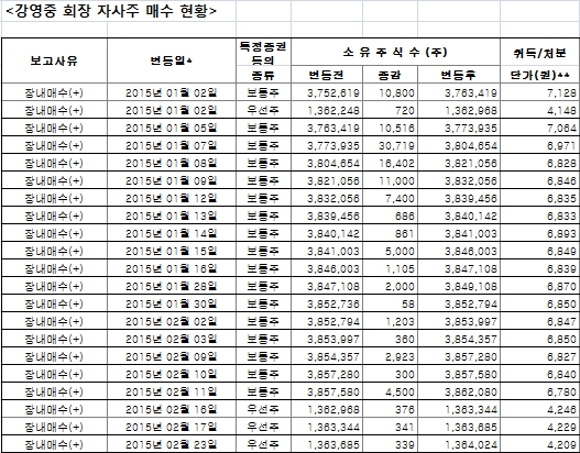 25일 증권업계에 따르면 강 회장은 올 들어 약 두 달 동안 21차례에 걸쳐 보통주 10만9461주와 우선주 1776주를 매수했다. 보통주 1주의 평균 주식가격이 6877원임을 감안하면 7억5276만원 어치를 매수한 셈이다. 우선주는 1776주(약 747만원)를 추가로 사들였다. 보통주의 경우 지난해 보통주 매수수량의 55%가 넘는 규모다.
