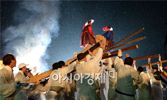 [포토]정월대보름 고싸움 놀이 광주시 남구 칠석동 고싸움놀이테마파크에서 제33회 고싸움놀이 축제 전야제가 열린 지난달 28일 많은 시만들이 참석한 가운데 풍등날리기, 달집태우기와 함께 야간 고싸움놀이가 펼쳐졌다. 사진제공=광주시 남구