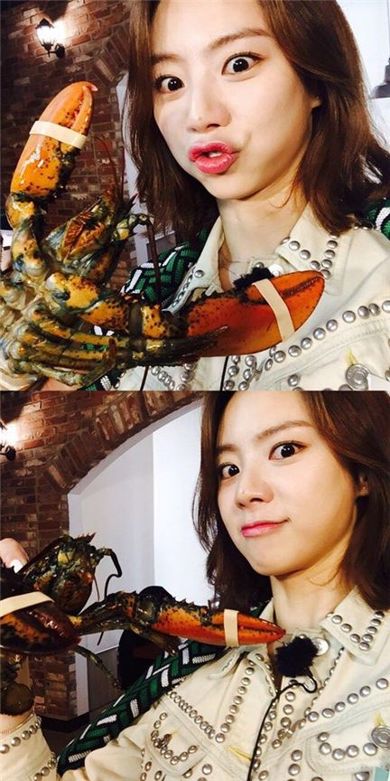 공개된 사진 속에는 박수진이 자신의 얼굴만 한 로브스터를 들고 카메라를 응시하고 있다. 다소 우스꽝스러운 표정을 짓고 있음에도 손색 없는 박수진의 미모가 눈길을 끈다.