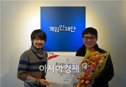 게임인재단이 24일 '힘내라! 게임인상' 수상작으로 코쿤비트가 개발한 액션RPG '크러쉬(CRUSH)'를 선정했다. 이시우 게임인재단 사무국장(왼쪽)과 고동환 코쿤비트 대표(오른쪽).