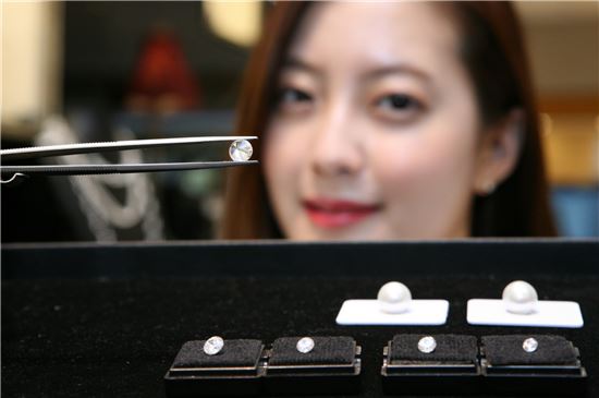 웨딩페어를 열고 있는 아이파크백화점은 ‘다이아몬드 원 플러스 원(1+1) 행사’를 진행한다. 1캐럿 다이아몬드 원석(599만원)을 구매하면 0.5캐럿 다이아몬드 원석(199만원)을 주며 0.5캐럿 다이아몬드 원석을 사면 0.3캐럿(55만원) 다이아몬드 원석을 증정한다. 15㎜ 남양진주(149만원)를 구매하면 13㎜ 남양진주(100만원)를 덤으로 준다. 이번 행사는 원석 구매에만 해당되며 반지나 귀걸이 등 장신구에 다는 세공 비용은 별도로 내야 한다.