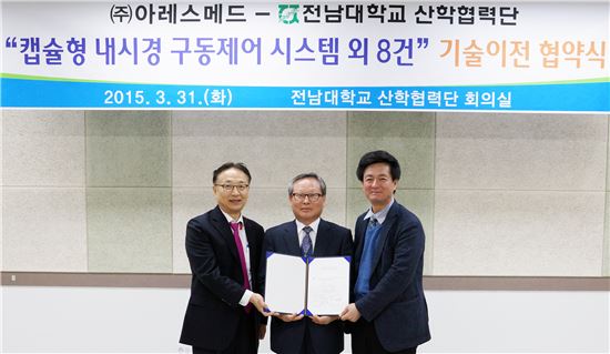 전남대학교 산학협력단(단장 송진규 ·건축학부 교수)은 31일 로봇연구소 박종오 교수팀이 개발한 ‘캡슐형 내시경 구동제어시스템’외 8건의 특허기술을 의료기기 전문기업 ㈜우영메디칼(회장 이영규)에 이전하는 계약을 체결했다