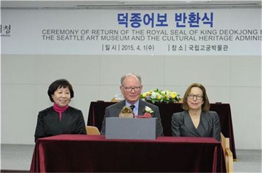 [아시아경제 오진희 기자] 미국 시애틀에서 덕종어보가 돌아왔다. 이 어보는 조선 제9대 임금 성종이 부친인 덕종을 기리기 위해 만든 인장이다. 덕종어보가 해외로 반출된 경위는 알 수 없지만, 다행히 한 고미술 수집가의 기증으로 미술관에서 52년간 보관해 오다 이번에 고국의 품으로 귀환하게 된 것. 그동안 정부 차원에서 유물 조사와 반환 요청이 있었고, 미술관과 기증자 유족 측이 적극적으로 협조하면서 이뤄진 어보 반환은 앞으로 불법 유출 문화재 반환에 모범사례가 될 것이란 평이다.