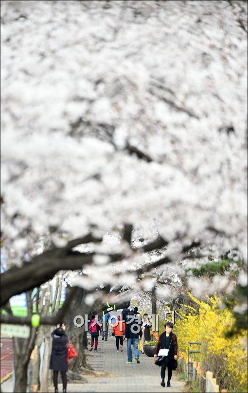 [아시아경제 윤동주 기자] 여의도 봄꽃 축제가 한창인 8일 서울 서여의서로(윤중로)에 만개한 벚꽃길을 시민들이 걸어가고 있다.