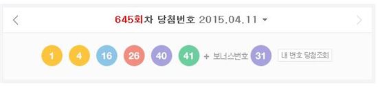 나눔로또에 따르면 로또 645회 당첨번호는 1, 4, 16, 26, 40, 41이다. 로또 645회 당첨번호의 보너스 번호는 31이다.