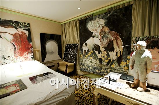 호텔 객실에서 진행되는 호텔 아트페어는 호텔 가구, 집기를 그대로 이용해 작품을 설치한다. 30만원부터 5000만원까지 폭넓은 가격대로 실제 집에 걸기 쉬운 중소 규모의 작품들이 다양하게 전시돼 있다.