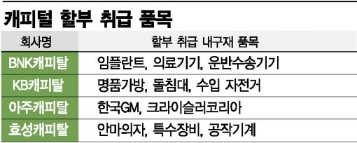 16일 업계에 따르면 BNK캐피탈은 전국에 제휴된 1700여개 치과와 제휴를 맺고 임플란트 치료비를 최대 9.9% 금리로 3~36개월 할부 납부하는 상품을 제공한다. BNK캐피탈이 선금을 내고 고객은 캐피탈에 할부금을 갚는 방식이다. 고객은 할부 기간을 선택할 수 있고 이에 따라 금리는 결정된다. 한샘, 에넥스대리점 등에서 파는 부엌가구를 6개월 무이자, 36개월 9.9%까지 할부로 취급하고, 가정용 안마의자도 36개월 무이자로 살 수 있다. 효성캐피탈도 자영업자를 대상으로 한 공작기계, 특수장비, 의료기기도 할부로 판매한다.