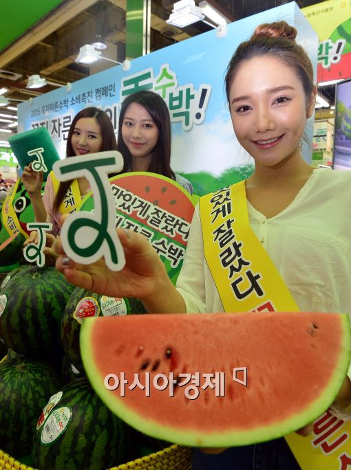 [아시아경제 최우창 기자] 22일 오전 서울 서초구 하나로클럽 양재점에서 열린 '꼭지자른 수박 소비촉진 홍보행사'에서 홍보 모델들이 수박을 들고 포즈를 취하고 있다.