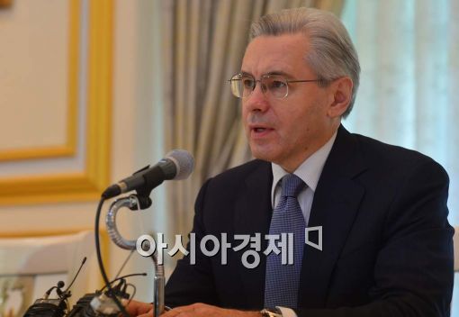 [아시아경제 백소아 기자] 알렉산드로 티모닌 주한러시아대사가 23일 서울 중구 러시아대사관에서 기자간담회를 열고 인사말을 하고 있다.