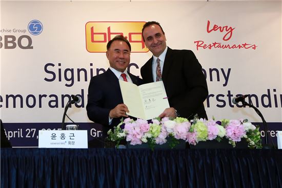 BBQ는 27일 서울 삼성동 그랜드인터콘티넨털 호텔에서 세계 최고 푸드 서비스 그룹인 컴패스(Compass) 그룹의 레비(Levy)사와 업무제휴 양해각서(MOU)를 맺고 미국 내 92개의 미국프로풋볼(NFL), 미국메이저리그(MLB), 미국프로농구(NBA), 미국대학농구(NCAA) 스타디움에 국내 최초로 입점할 수 있는 길을 열게 됐다.