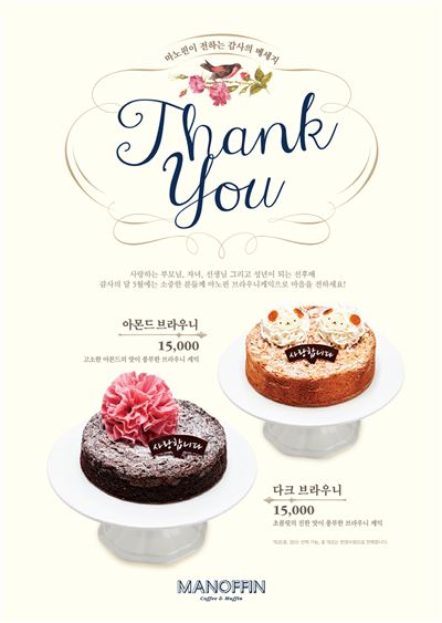 가격은 각각 1만5000원이며, 5월 한달 동안 한시적으로 판매된다. 마노핀은 가정의 달 선물용으로 브라우니케익을 구매하는 고객을 대상으로 케익과 함께 감사의 마음의 전할 수 있는 감사카드를 증정한다.