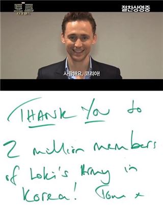 톰 히들스턴은 로키를 상징하는 초록색 펜으로 적은 자필 편지를 통해 '한국에 계신 로키의 200만 팬들에게 정말 감사드립니다!(Thank you to 2 million members of Loki's Army in Korea!)'는 메시지를 전했다.