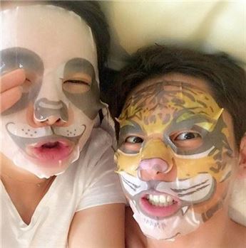 사진에는 안현수 우나리 부부가 얼굴에 팩을 붙인 채 침대에 누워있는 모습이 담겨있다. 두 사람의 다정한 모습과 익살스러운 표정이 눈길을 끈다.