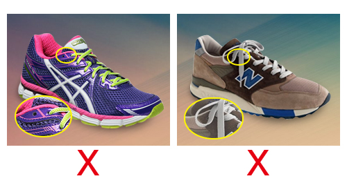 왼쪽 사진에서처럼 러닝화의 끝 구멍을 끈으로 꿰지 않는 사람이 많다. 오른쪽 사진은 마지막 구멍을 꿰었지만 방법이 맞지 않다. 유명 브랜드 러닝화 사이트에도 위와 같은 모습이 흔히 보인다.