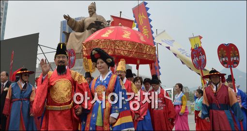 [아시아경제 윤동주 기자] 세종대왕 탄생일을 기념해 15일 서울 광화문광장에서 열린 '세종탄신 618주년 큰잔치'에서 참가자들이 세종대왕 등 왕실 복장을 하고 행진을 하고 있다.
