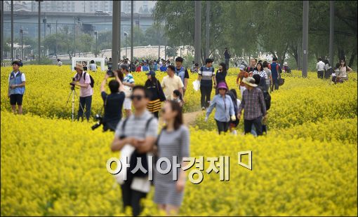 [아시아경제 윤동주 기자] 2015 한강 서래섬 유채꽃 축제가 열린 17일 서울 서초구 서래섬을 찾은 시민들이 유채꽃 밭 사이를 거닐며 즐거운 시간을 보내고 있다.