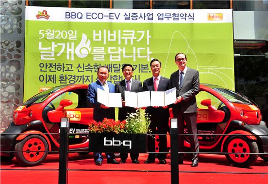 BBQ는 20일 제르노삼성자동차와 초소형전기차 실증운행 업무협약(MOU)을 체결하고 치킨프랜차이즈 BBQ의 배달용 스쿠터를 초소형 전기차로 교체하기 위한 실증운영에 나서기로 했다.