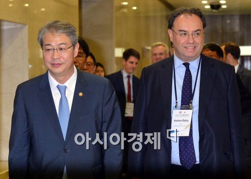 [아시아경제 최우창 기자] 임종룡 금융위원장(왼쪽)과 앤드류 베일리(Andrew Bailey) 영란은행(BOE) 부총재 겸 영국 건전성감독청(PRA) 청장이 28일 서울 명동 은행회관에서 열린 '제2차 한·영 금융협력포럼'에 참석하기 위해 입장하고 있다.
