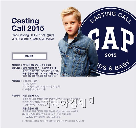 갭키즈는 매거진 메종과 함께 ‘갭 캐스팅 콜 2015’ 이벤트를 실시, 베이비(0세~5세)남녀 모델, 키즈(6세~13세) 남녀 모델 각각 5명씩 총 20명을 선발할 예정이다.