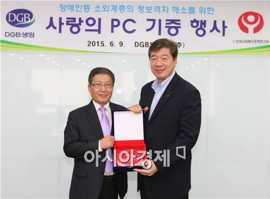 DGB생명은 9일 서울 본사에서 한국사회복지정책연구원 산하 사랑의 PC보내기운동본부에 PC전달식을 진행했다. 왼쪽부터 김정우 사랑의 PC보내기 운동본부장, 오익환 DGB생명 대표(자료:DGB금융그룹)