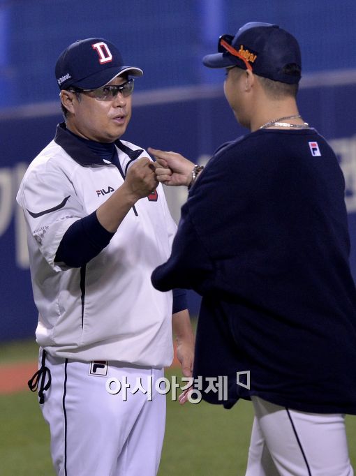 [잠실=아시아경제 김현민 기자] 2015 KBO리그 두산 베어스와 LG 트윈스의 경기가 9일 잠실야구장에서 열렸다. 5.2이닝 1실점 호투로 시즌 8승째를 따낸 두산 선발 유희관이 팀의 5-2로 승리를 확정한 뒤 김태형 감독과 하이파이브하고 있다.