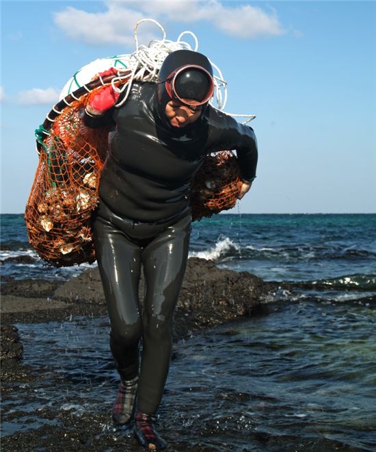 [아시아경제 조슬기나 기자]검은 고무 옷을 입은 해녀들이 바다 위로 올라와 가쁜 숨을 내뱉을 때마다, '호오이 호오이' 가느다란 휘파람소리가 해안가에 흩어진다. 숨을 참고 참다 내뱉는 '숨비소리'다. 경력 30년이 넘은 제주해녀 강애심씨는 "내 나이 32세에 시어머니께 끌려나와 울면서 물질을 배웠다"며 "이제는 바다가 친정엄마"라고 미소 지었다.