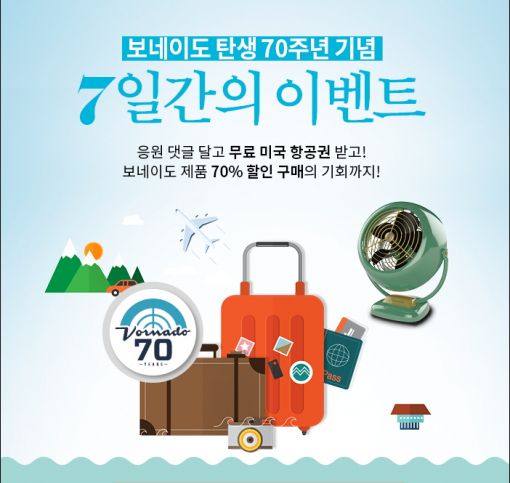 보네이도코리아 공식 브랜드 홈페이지에서는 보네이도 탄생 70주년 기념 응원 댓글 이벤트를 진행하고 현재 보네이도 제품의 초기 모델이 출시된 1945년을 기념해 1945개의 댓글이 모이면 추첨을 통해 미국 시카고 왕복 황공권(1인 2매)과 보네이도 초기 모델을 현대적으로 재해석해 선보인 시그니처팬(7명) 등을 증정한다. 또한 6월 18일부터 7월 20일까지 총 7일간 보네이도의 인기 모델을 선착순으로 70명에게만 70%의 할인 판매를 실시한다. 할인 혜택 모델은 당일 행사 오픈 시 공개되며 자세한 행사일과 참여 방법은 공식 홈페이지(www.vornado.co.kr)에서 확인이 가능하다.