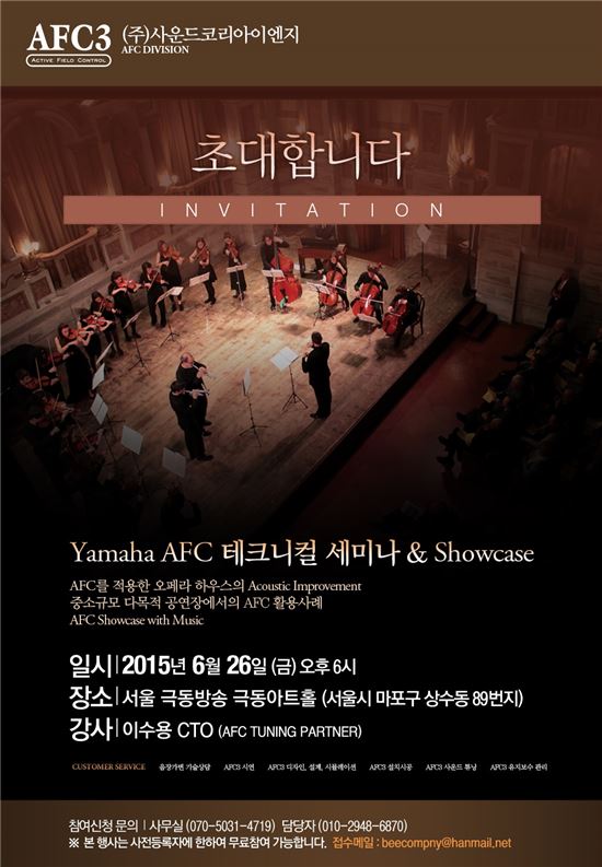이번 행사는 최근 AFC를 적용한 서울 극동방송 극동아트홀에서 오는 26일 오후 4시부터 7시40분까지 진행된다. 국내 야마하 AFC 튜닝 파트너인 사운드코리아이엔지의 최고기술경영자(CTO) 이수용 동아방송예술대 교수가 AFC 설명 및 실제 적용 사례를 소개할 예정이다. 또한 AFC의 성능을 경험할 수 있는 쇼케이스 형식의 작은 음악회도 개최된다.