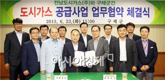 [아시아경제 이진택]구례군은 23일 군청 상황실에서 서기동 구례군수, 한봉근 전남도시가스(주) 대표이사 등이 참석한 가운데 구례군 도시가스 공급사업 추진을 위한 업무 협약을 체결했다.