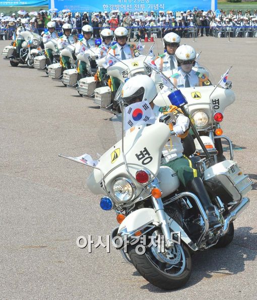 [아시아경제 백소아 기자] 28일 서울 영등포구 여의도공원 문화의마당에서 열린 제1회 6.25전쟁 한강방어선 전투기념식에서 수방사 헌병대가 모터사이클 퍼레이드를 선보이고 있다.