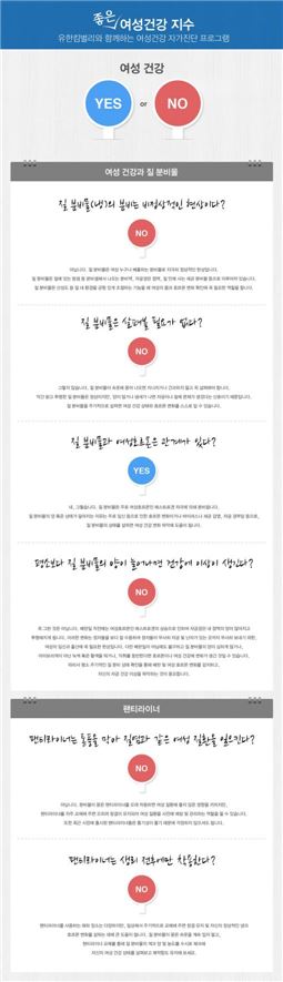 '좋은 여성 건강 지수' 체크리스트는 유한킴벌리 홈페이지에 제공되며(www.yuhan-kimberly.co.kr/yk_pressroom/board/newagenda_list.asp), 여성건강 지식, 라이프 스타일, 위생 습관 등 관련 항목들에 대한 설문을 통해 현재 본인의 여성건강 상태와 건강지식 정도, 좋은 생활 습관 실천 정도를 확인할 수 있다.