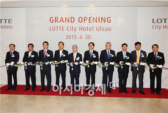 울산 최초 업스케일 호텔 '롯데시티', 30일 개관 30일 오전 롯데시티호텔울산에서 열린 개관식에서 롯데호텔 송용덕 대표이사 사장(오른쪽에서 여섯번째)과 김기현 울산광역시 시장(오른쪽에서 다섯번째)를 비롯한 내외빈들이 테이프 커팅식을 하고 있다.